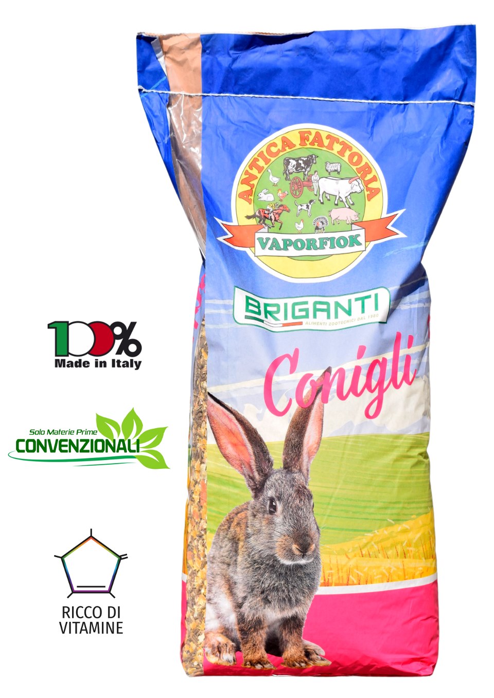 Mangime completo per fattrici e coniglietti dallo svezzamento in poi. La sua formulazione ad alto contenuto proteico (18%) proveniente da soia e completa di coccidiostatico è stata studiata per fornire supporto alla fattrice e un’alimentazione ben bilanciata per tutto il ciclo di vita del coniglio. Va somministrato asciutto a volontà. La somministrazione del prodotto va comunque sospesa 5 giorni prima della macellazione salvo diversa disposizione.